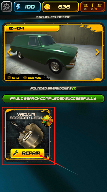 2、发现真空助力器泄漏故障,点击REPAIR按钮开始修理损坏的真空助力器。
