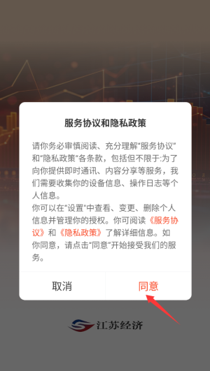 1、启动江苏经济APP后,首次使用需阅读并同意用户协议和隐私政策,点击确认进入主界面。