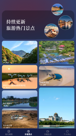 3、点击"乐看景点"选项,浏览全球各地风景名胜的高清图片和介绍。