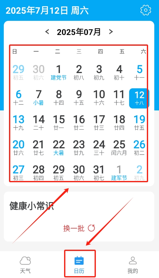 4、想看看日历相关内容,在软件里找到日历页面点进去,就能看到日期还有对应日期的天气情况,很实用。