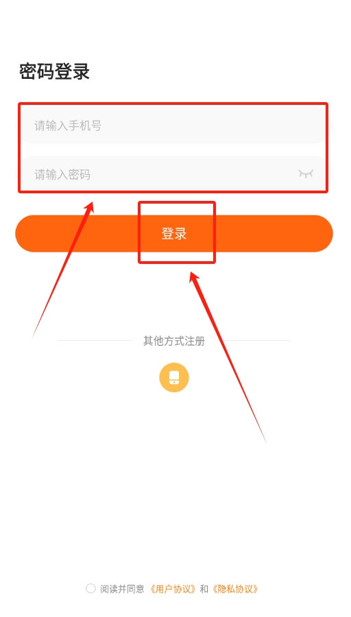 4、要是没有账号的话,就在注册页面输入手机号,再设置一个密码,填好后完成注册,注册成功就能登录了。