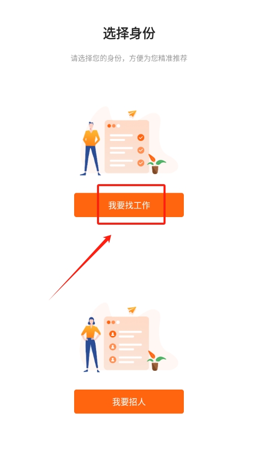 2、接着会看到身份选择页面,根据自己的需求选我要找工作或者我要招人,选好后就能进入对应的功能界面。