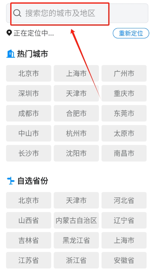 2、接着在页面上方的搜索框里输入想要查询的城市地址,输入完成后点击搜索,就能找到该城市的天气信息。