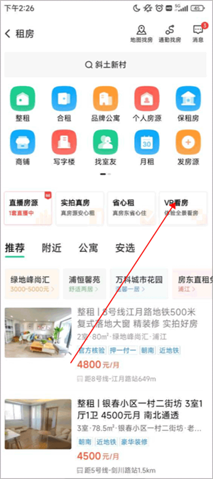 2、进入租房界面,找到vr看房,这边还包括了直播房源,实拍真房,省心租功能
