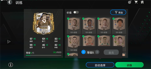 1、在训练界面中,通过使用低能力值的球员卡作为材料可以提供相应的经验值提升;