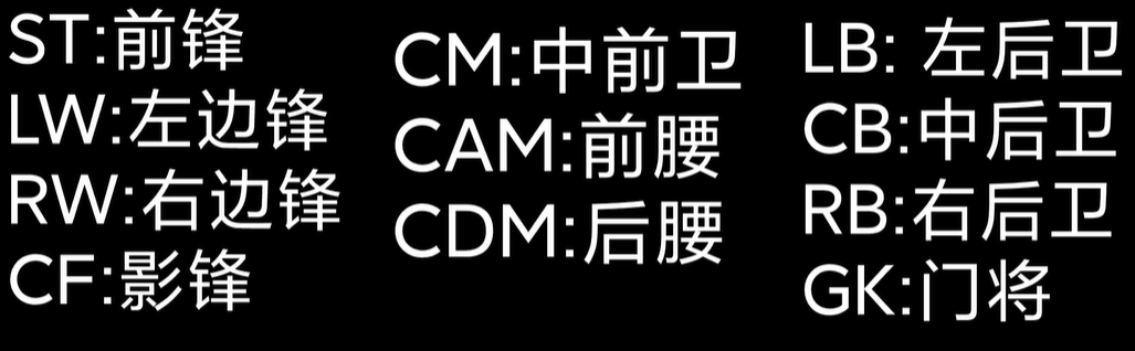 2、不同球员拥有自己对应的位置,以缩写的方式呈现,缩写对应的具体位置如下;
