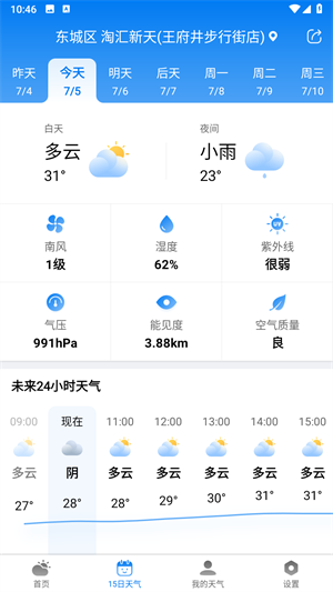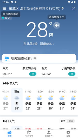 1、今明天气:清晰展示今天和明天的天气情况,让您轻松掌握未来两天的天气变化,为日常出行做好准备。