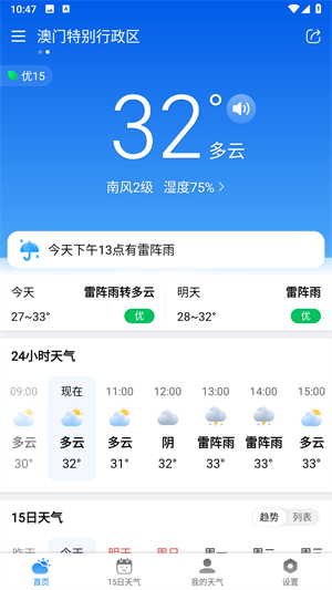 2、点击15日天气,可以直观看到15天内天气的变化。