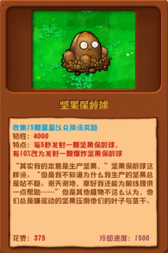 4000韧性,每5秒发射一颗坚果保龄球,有概率发射爆炸坚果保龄球。