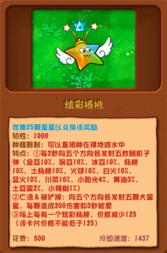 1000韧性,可以在裸地以及水中种植,每2秒向5个方向发射五枚随机子弹,从场上离开时向5个方向发射五科大星星,场上每个同名植物会降低炫彩杨桃125价格,最低125。