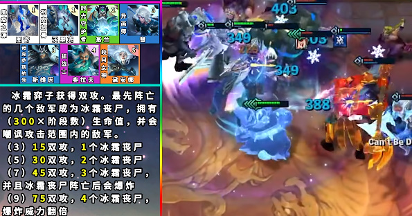 冰霜:包括图奇、沃里克等,效果是增加法术和攻击力,能冻结阵亡的敌人,将其变为友方的冰霜战士。