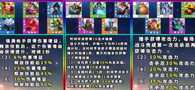 时间学派:弈子包括贾克斯、基兰、薇古丝等,效果是增加法术强度,并在战斗开始时进入16秒倒计时,每释放一个技能减少倒计时,倒计时结束时提供特殊加成。
