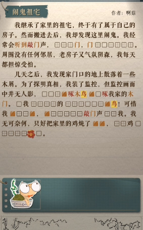最终,主角发现让他担惊受怕的“鬼”其实是一只鸟。尽管他抓不住它,但它还是经常用敲门声骚扰他。无奈之下,他把家里的鸡炖了泄愤,因为鸡也算是一种鸟。
