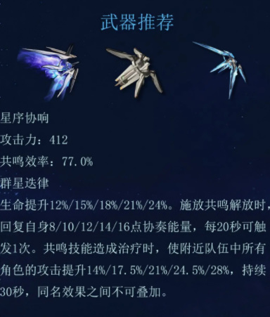 由于守岸人需求较高的共鸣效率,因此在武器的选择上都推荐选择带有共鸣效率词条的武器,配合角色。高阶的奇幻变奏与专武差距不大,节省资源的情况下可以不抽专武,低阶奇幻变奏或0阶奇幻变奏还是相对更推荐守岸人的专武。