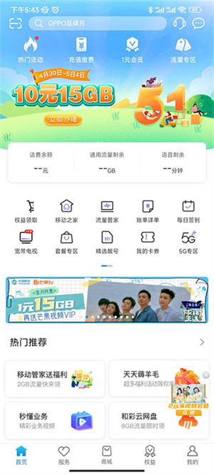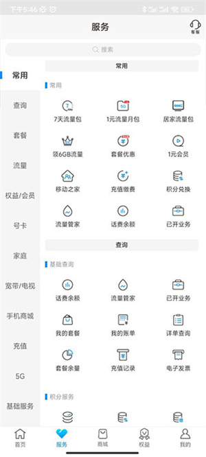 2、里面还拥有流量、套餐、权益会员等多种服务。