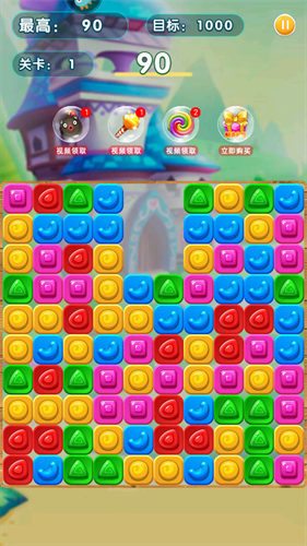 3、游戏采用了传统的三消规则,玩家需要通过点击交换的方式将同色方块连成一线进行消除,玩家需要在有限步骤中达到对应分数;