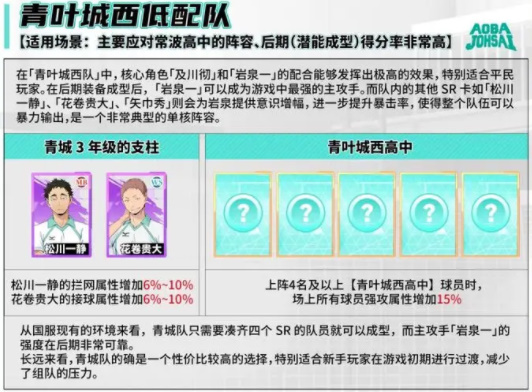青叶城西队:注重球员意识和配合,核心成员为及川彻和岩泉一。这套阵容适合平民玩家,操作难度较低,容易培养,适合单核体系。