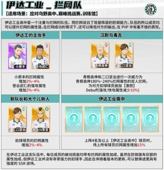 伊达工业队:偏向拦网与防守,核心成员包括二口坚治和茂庭要。这套阵容在PVP对抗中尤为出色,适合喜欢防守反击战术的玩家。