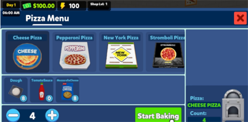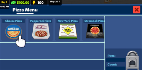 3、在弹出的披萨菜单中提供了不同披萨类型供玩家选择,根据需求点击准备制作的披萨;