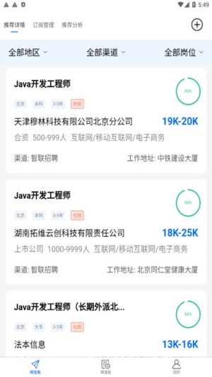1、智能职位搜索:支持30余个筛选条件组合查询,结果按匹配度智能排序,提供精准的岗位推荐。