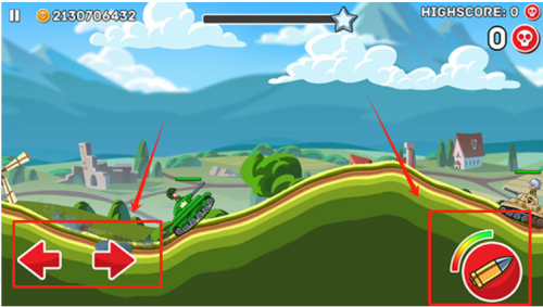 2、然后正式开始,左下角的左右箭头分别是战车的前进和后侧,而右侧则是射击按钮,头顶的绿色血条就是自己战车的血量,注意要用最小的损伤换取更多的胜利。