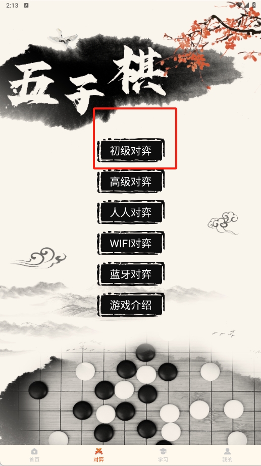 1、下载游戏后,进入游戏,紧接着进入初级对弈,开启一场与机器人的五子棋大战。