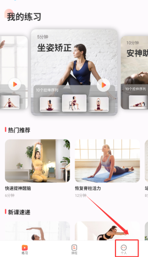 1、新手快速入门。完成体态测试后推荐3套入门课程。每日提醒培养运动习惯。