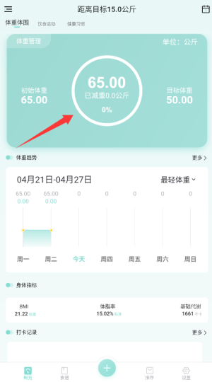 2、每日定时记录体重和饮食情况,APP自动同步更新健康数据看板。