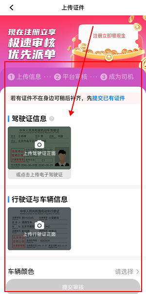 3、输入驾驶证、行驶证和车辆等信息,点击“提交审核”,审核通过就可以加入了。
