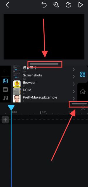 4、上面的灰色横岗往上滑可以把屏幕缩小,右下方的灰色横杠往下滑可以添加素材。