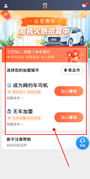 1、打开众至出行app,选择加入方式点击“加入赚钱”。