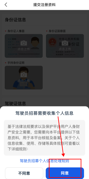 3、输入身份证、驾驶证等信息点击“提交材料”,审核通过就可以加入赚钱了。