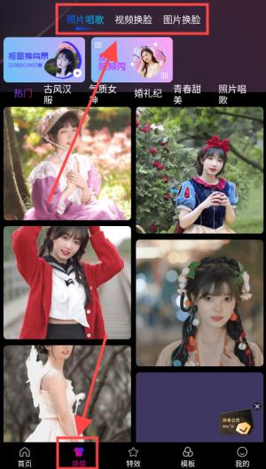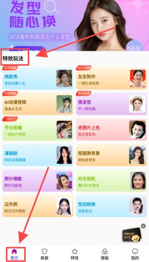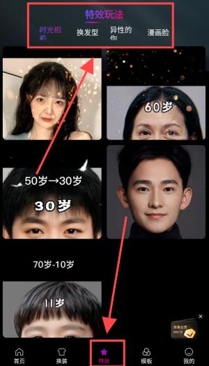 3、特效页面有时光相机、换发型、异性的你和漫画脸等玩法。