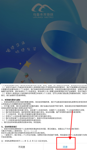 1、打开乌鲁木齐地铁app,点击“同意”。