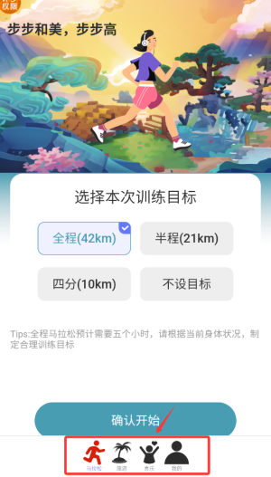 1、目标设定:选择赛事类型(全马/半马),设置完赛时间目标。