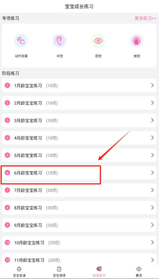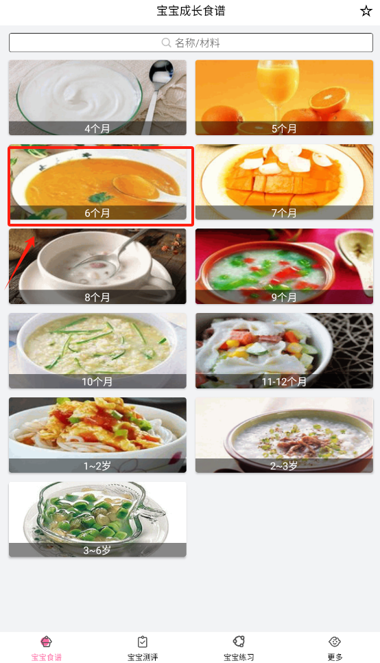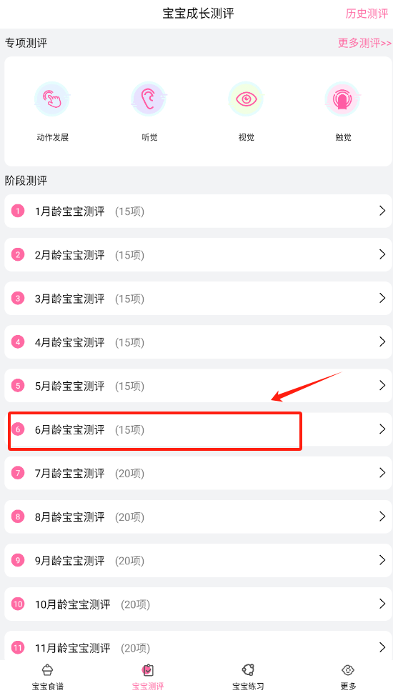 3、点选同样的月份对宝宝进行测试,就会推送适合宝宝的食谱。