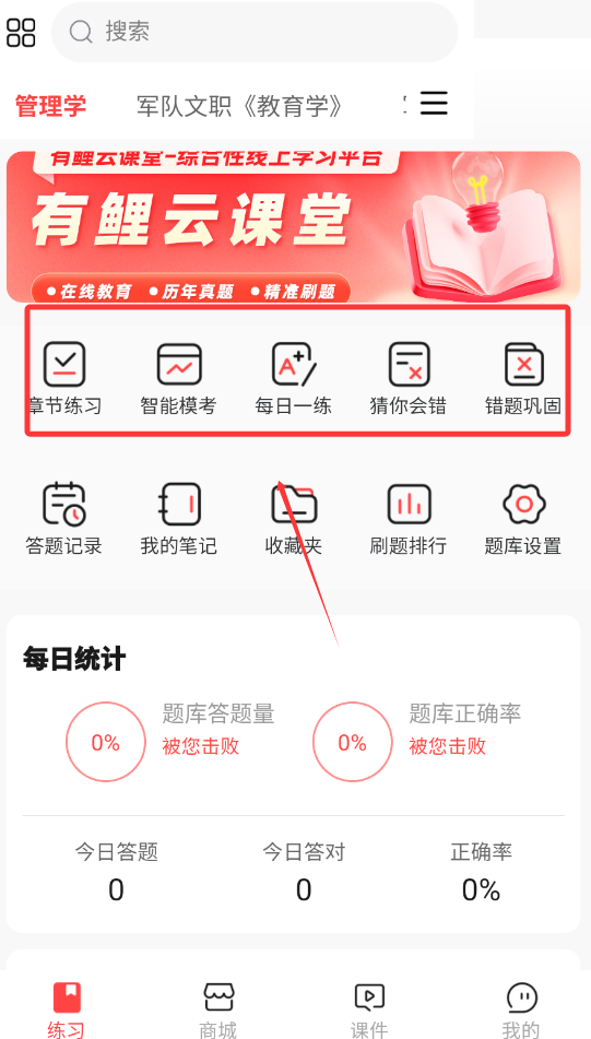 1、题库练习模块提供按章节、知识点、难度等多种筛选方式,支持随机组题和顺序刷题两种训练模式。