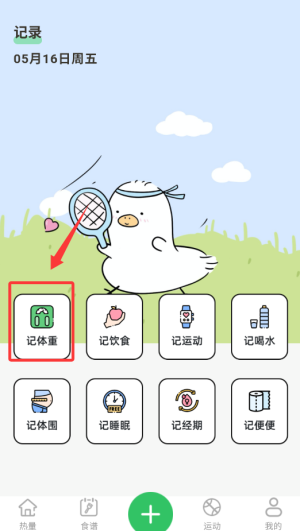 2、在弹出的功能选项中,选择"记体重"进入记录页面。