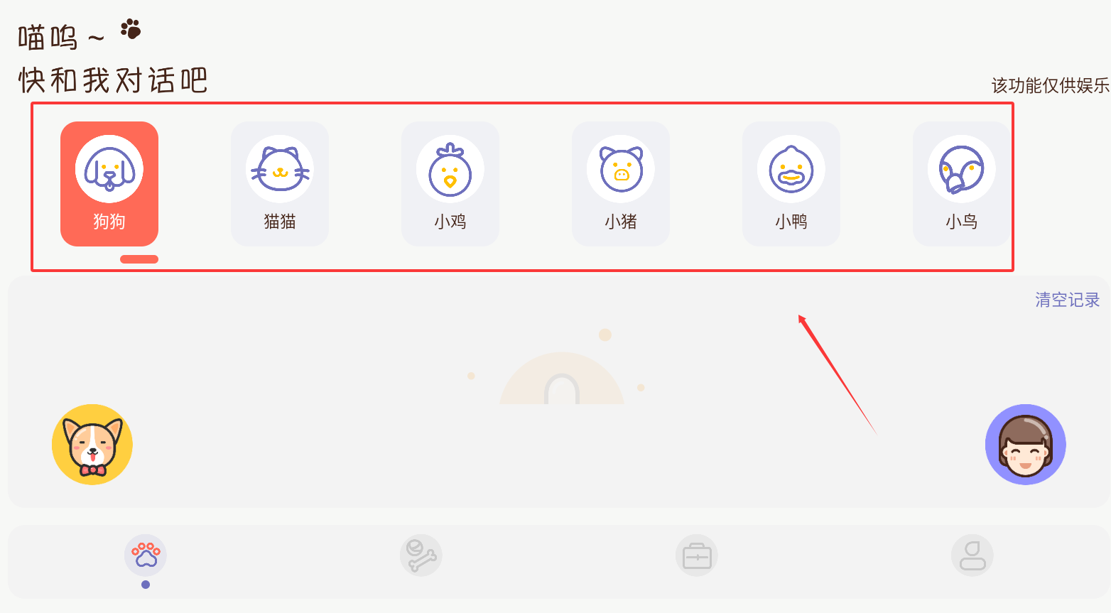 1、进入首页,可以选择宠物种类,点击录音即可对话,放给宠物听即可。