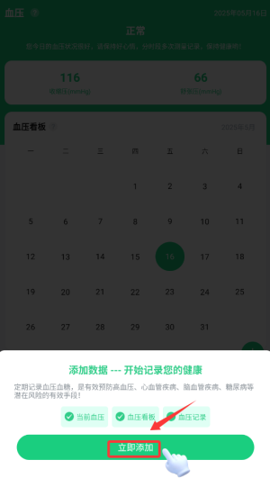 1、首次启动应用时,系统会引导用户在首页添加血压测量数据。