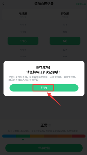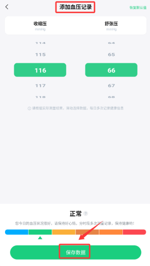 3、点击"保存记录"按钮存储数据,建议每日定时测量形成健康档案。