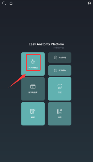 1、进入应用后,在首页选择"解剖模型"功能进入3D资源库。