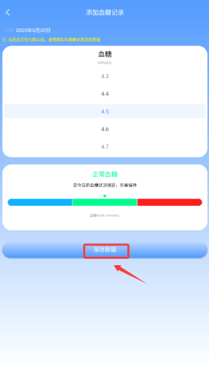 3、填写当前测量的血糖值并选择测量时间,保存后自动生成变化曲线图。