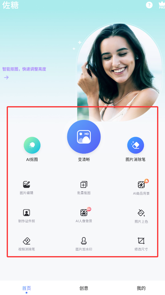 1、启动佐糖APP后,首页展示AI抠图、背景替换等实用功能模块,根据需求选择相应服务。