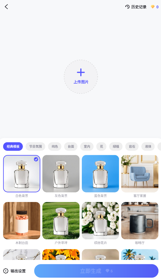 2、使用"商品换背景"功能时,上传产品图片后可从海量模板库挑选合适的背景素材进行替换。