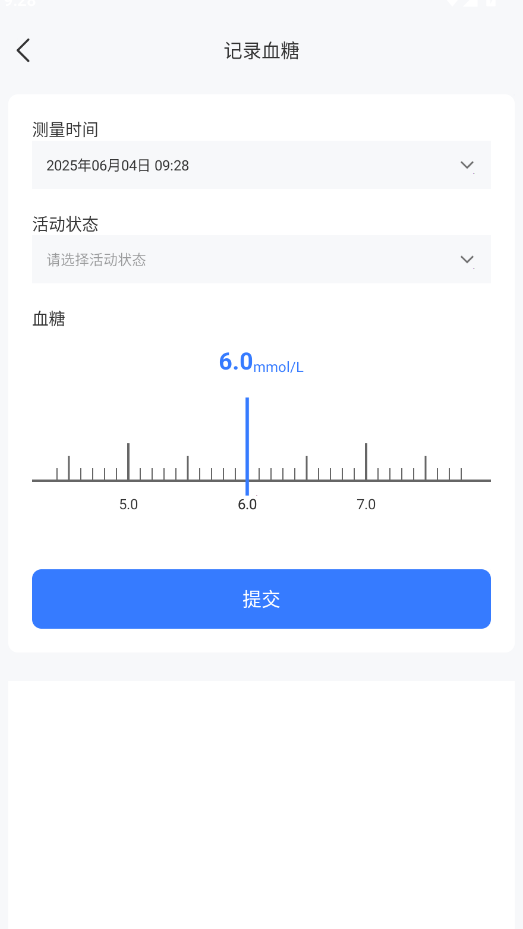 2、在记录页面可手动输入当前血糖数值,并设置对应的测量时间点保存数据。