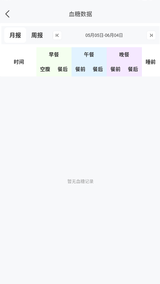 3、系统自动生成周报/月报统计图表,便于用户查看血糖变化趋势。