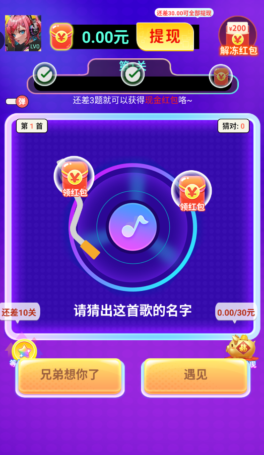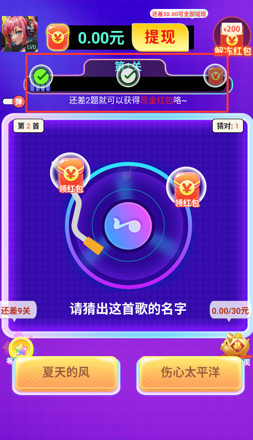 2、游戏界面顶部显示进度条,每猜对一首歌会累积进度,达到指定节点可领取对应奖励。