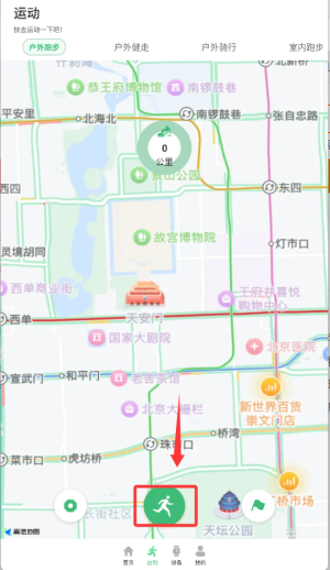 2、选择"户外跑步"功能并点击开始按钮,系统将实时追踪运动轨迹和消耗卡路里。