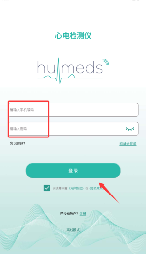 1、启动心电检测仪配套APP后,使用手机号验证登录个人账户,确保数据同步保存。